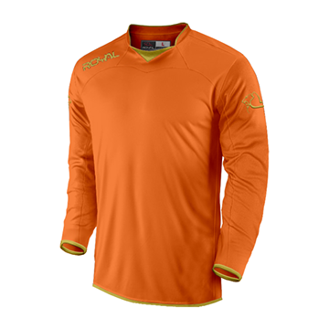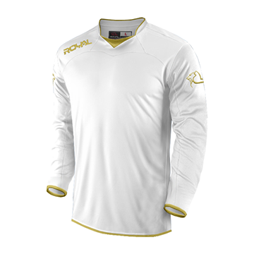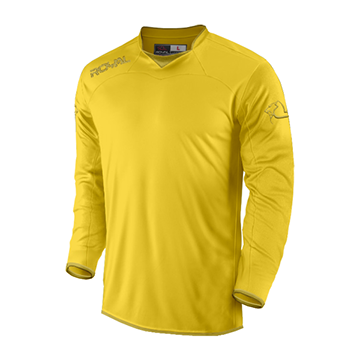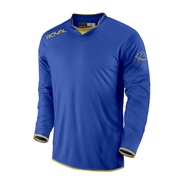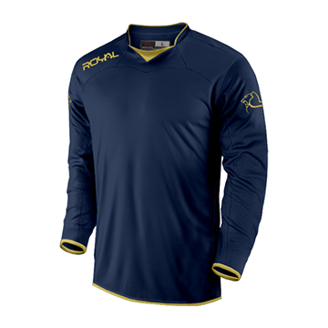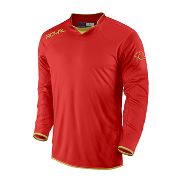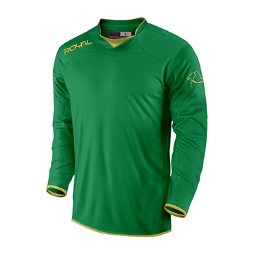 Camiseta futbol BRYAN M/L. Cuello redondo detalle en V. Tejido transpirable agradable al tacto y de fácil secado. Color liso con contraste en dorado en puños, cuello y bajos. Tejido dynamic stretch.